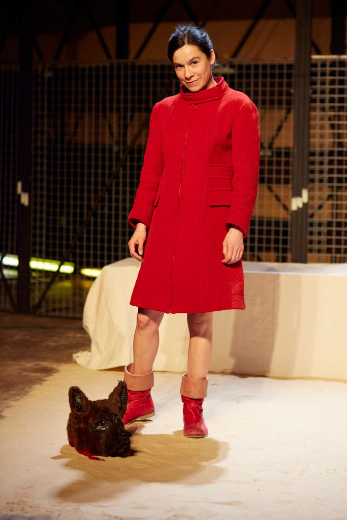 Au départ il y a une femme-statut qui accouche d’elle-même. Non ce n’est pas ça. Au départ il y a un petit chaperon rouge qui traverse le plateau en tenant à la main la tête décapitée du loup. Mais non ce n’est pas ça non plus. Au départ il y a un vieux. Il est mort et il rencontre le petit chaperon rouge à la tête de loup. Oui c’est ça le départ. Non, au départ il y a des contes. Non au départ, il n’y a rien, il y a le vide, puis il y a la naissance, le chaperon rouge, la femme-statut, le prince, le vieux, l’amour, la mort. Voilà c’est ça le départ. Il était une fois un vieux qui avait croqué une pomme et alors…